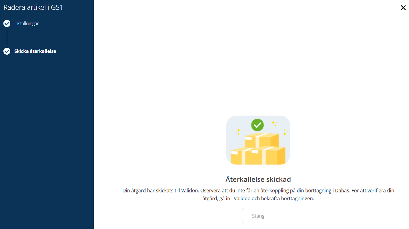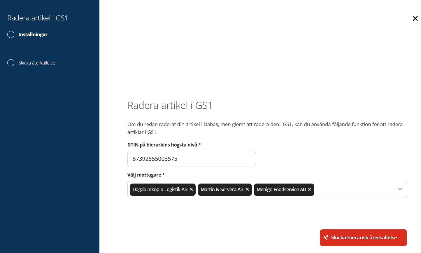 Scrolla ner till Radera artikel i GS1/Validoo (Hierarkisk återkallelse/Publication withdrawal)